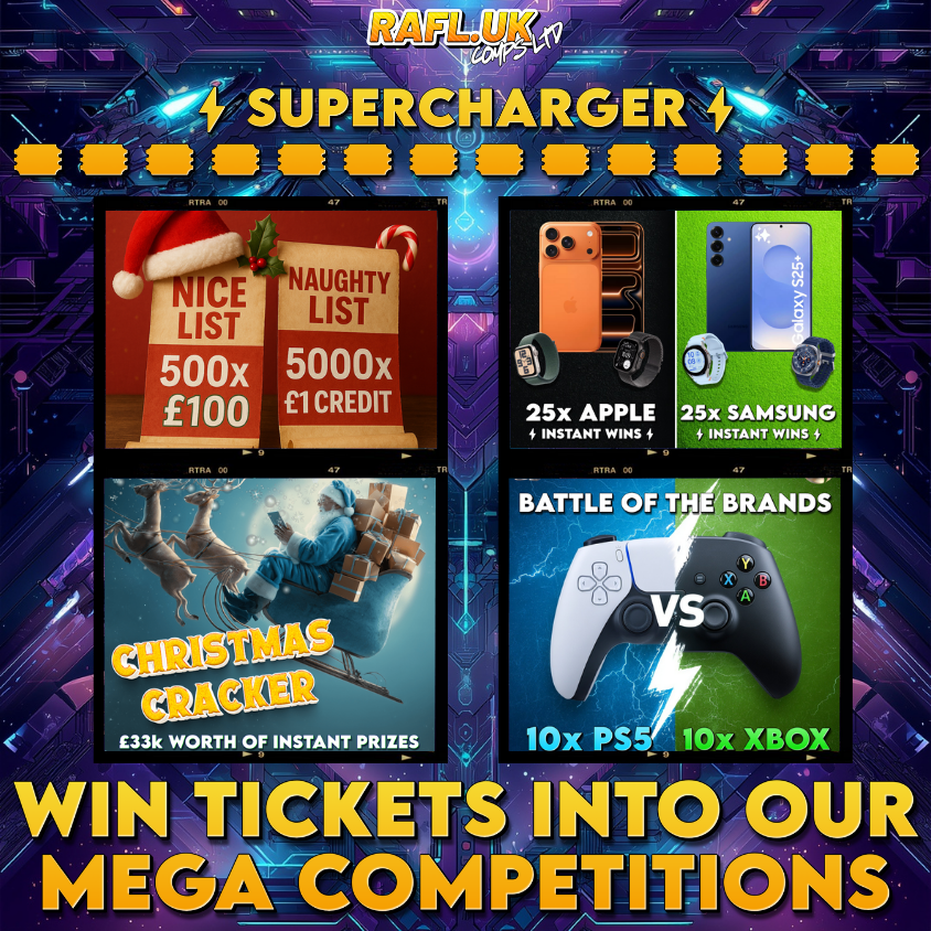 You may enter the competition online or for free by post by sending your entry to RAFL UK COMPS LTD on a postcard. You must have an account on RAFL UK COMPS LTD for your entry to be processed. All details on your entry MUST correspond to the details on your account to receive the order confirmation and ticket number. Postal entries received without a registered account cannot be processed.